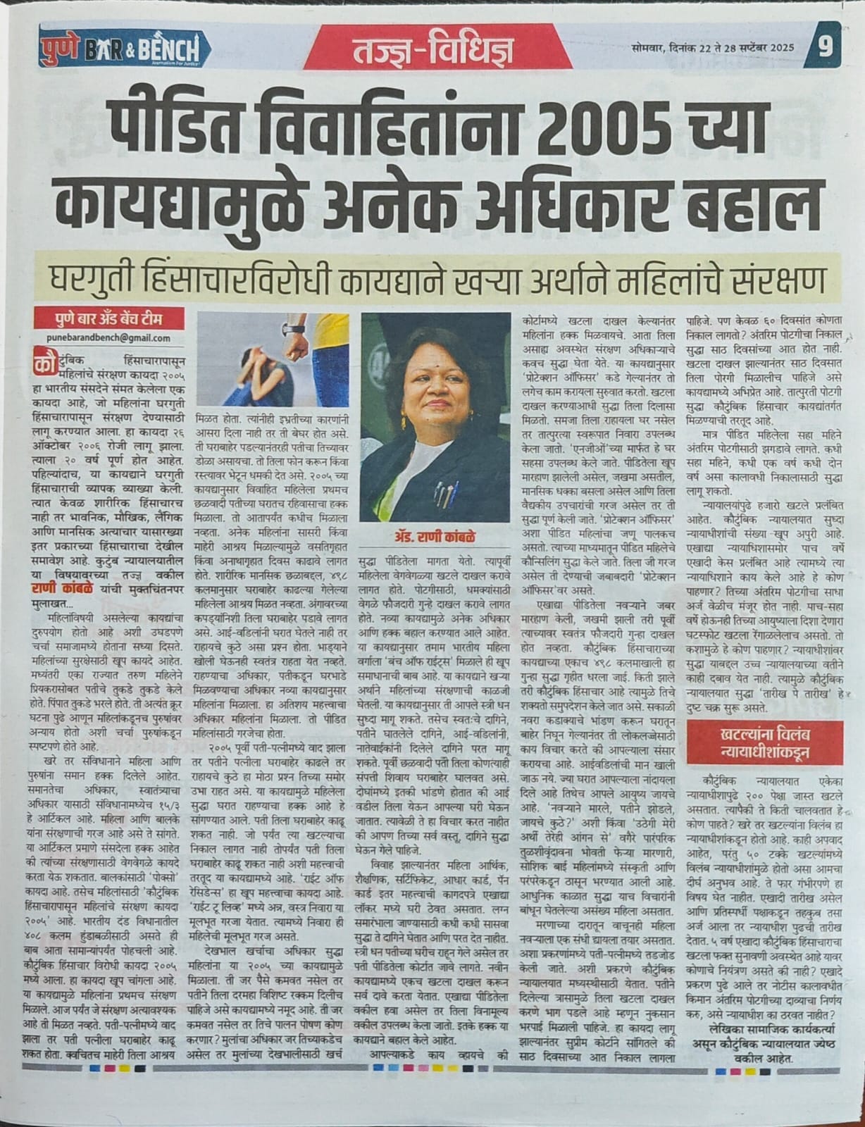 कौटुंबिक हिंसाचारापासून महिलांचे संरक्षण कायदा २००५ हा भारतीय संसदेने संमत केलेला एक कायदा आहे, जो महिलांना घरगुती हिंसाचारापासून संरक्षण देण्यासाठी लागू करण्यात आला. हा कायदा २६ ऑक्टोबर २००६ रोजी लागू झाला. त्याला २० वर्ष पूर्ण होत आहेत. पहिल्यांदाच, या कायद्याने घरगुती हिंसाचाराची व्यापक व्याख्या केली त्यात केवळ शारीरिक हिंसाचारच नाही तर भावनिक, मौखिक, लैंगिक आणि मानसिक अत्याचार यासारख्या इतर प्रकारच्या हिंसाचाराचा देखील समावेश आहे. कुटुंब न्यायालयातील या विषयावरच्या तज्ज्ञ वकील राणी कांबळे यांची मुक्तचिंतनपर मुलाखत