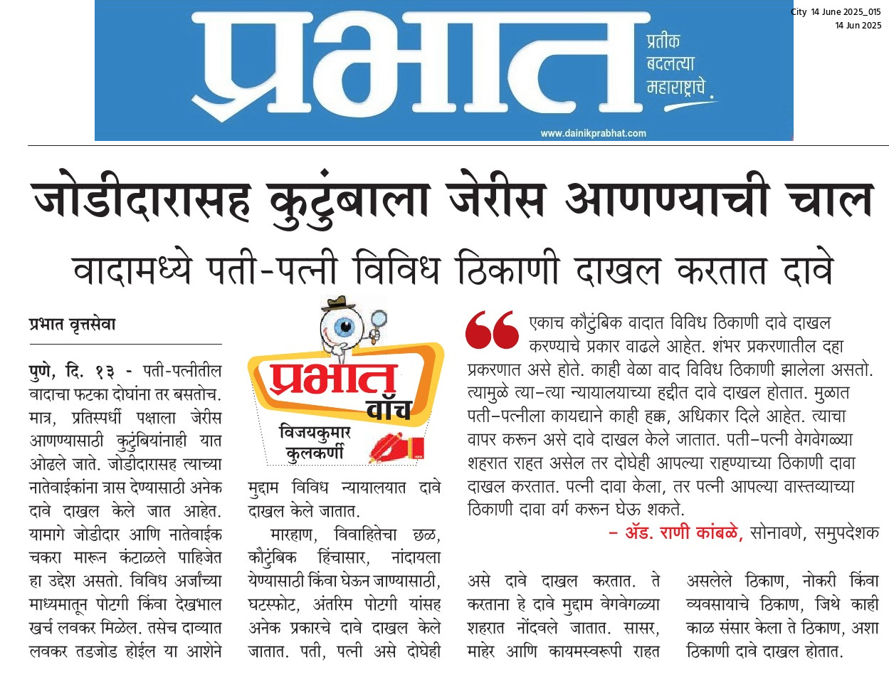 ‘‘एकाच कौटुंबिक वादात विविध ठिकाणी दावे दाखल करण्याचे प्रकार वाढले आहेत. शंभर प्रकरणातील दहा प्रकरणात असे होते. काही वेळा वाद विविध ठिकाणी झालेला असतो. त्यामुळे त्या-त्या न्यायालयाच्या हद्दीत दावे दाखल होतात. मुळात पती-पत्नीला कायद्याने काही हक्क, अधिकार दिले आहेत. त्याचा वापर करून असे दावे दाखल केले जातात. पती-पत्नी वेगवेगळ्या शहरात राहत असेल तर दोघेही आपल्या राहण्याच्या ठिकाणी दावा दाखल करतात. पत्नी दावा केला, तर पत्नी आपल्या वास्तव्याच्या ठिकाणी दावा वर्ग करून घेऊ शकते.’’